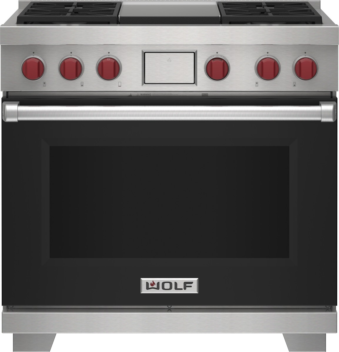 Wolf® 36" Stainless Steel Pro Style Dual Fuel Range with Black Door features dual-stacked, sealed burners, Dual VertiFlow™ convection system, Gourmet Mode, 10 chef-created cooking modes, LED backlit control bezels, self-clean, delayed start, timed cook, and Sabbath features.Read More