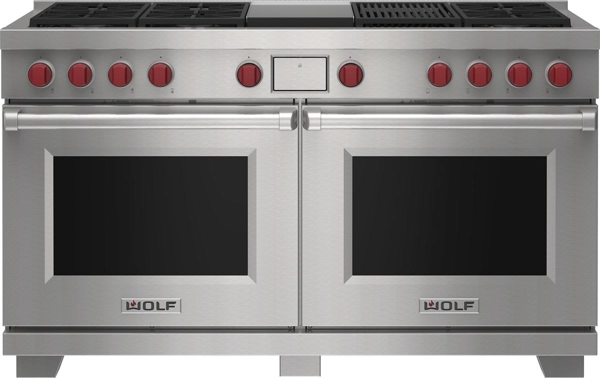 Wolf® 60" Stainless Steel Freestanding Dual Fuel Range and Infrared Charbroiler and Infrared Griddle features dual-stacked, sealed burners, Dual VertiFlow™ convection system, Gourmet Mode, 10 chef-created cooking modes, LED backlit control bezels, self-clean, delayed start, timed cook, and Sabbath features.Read More